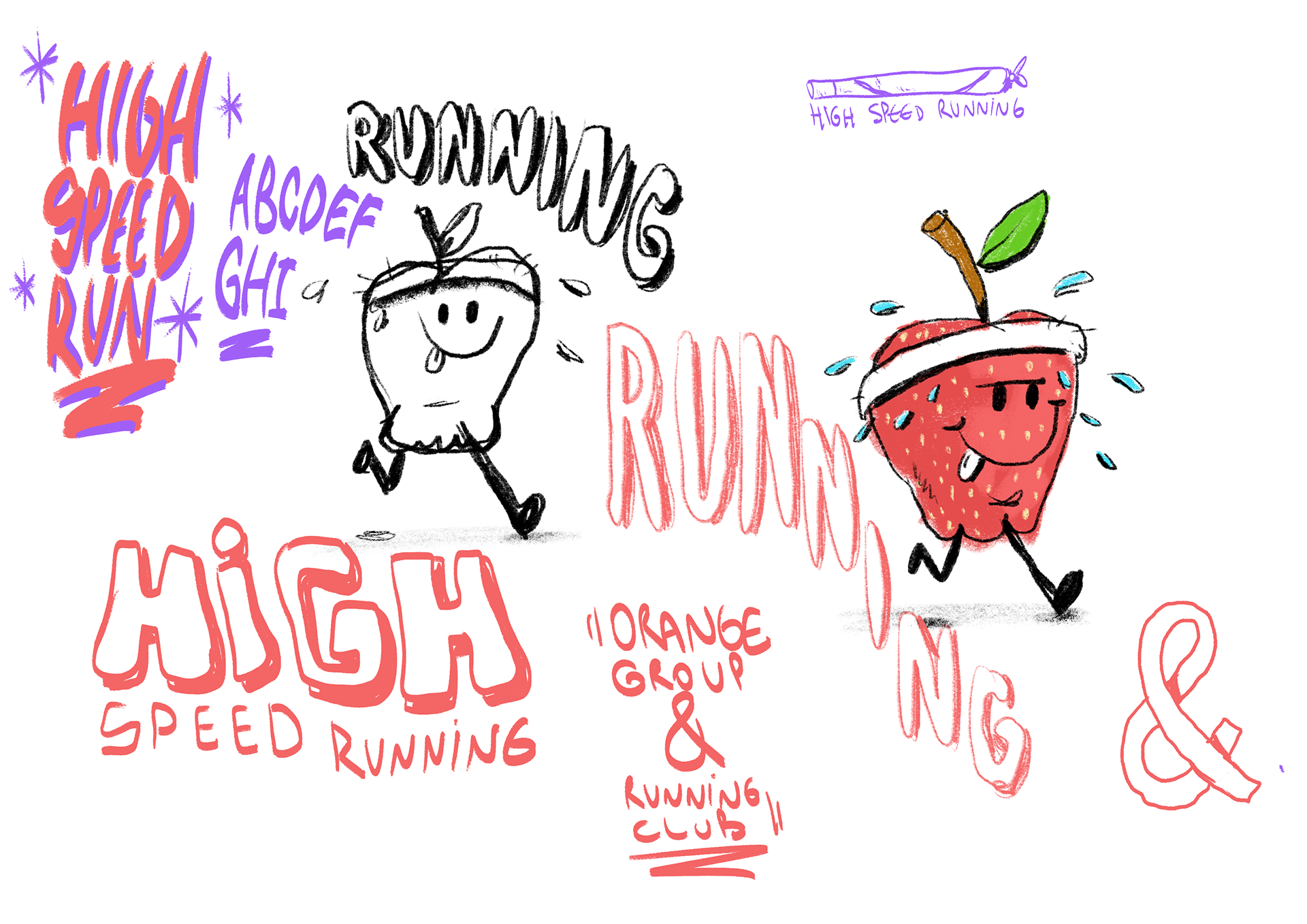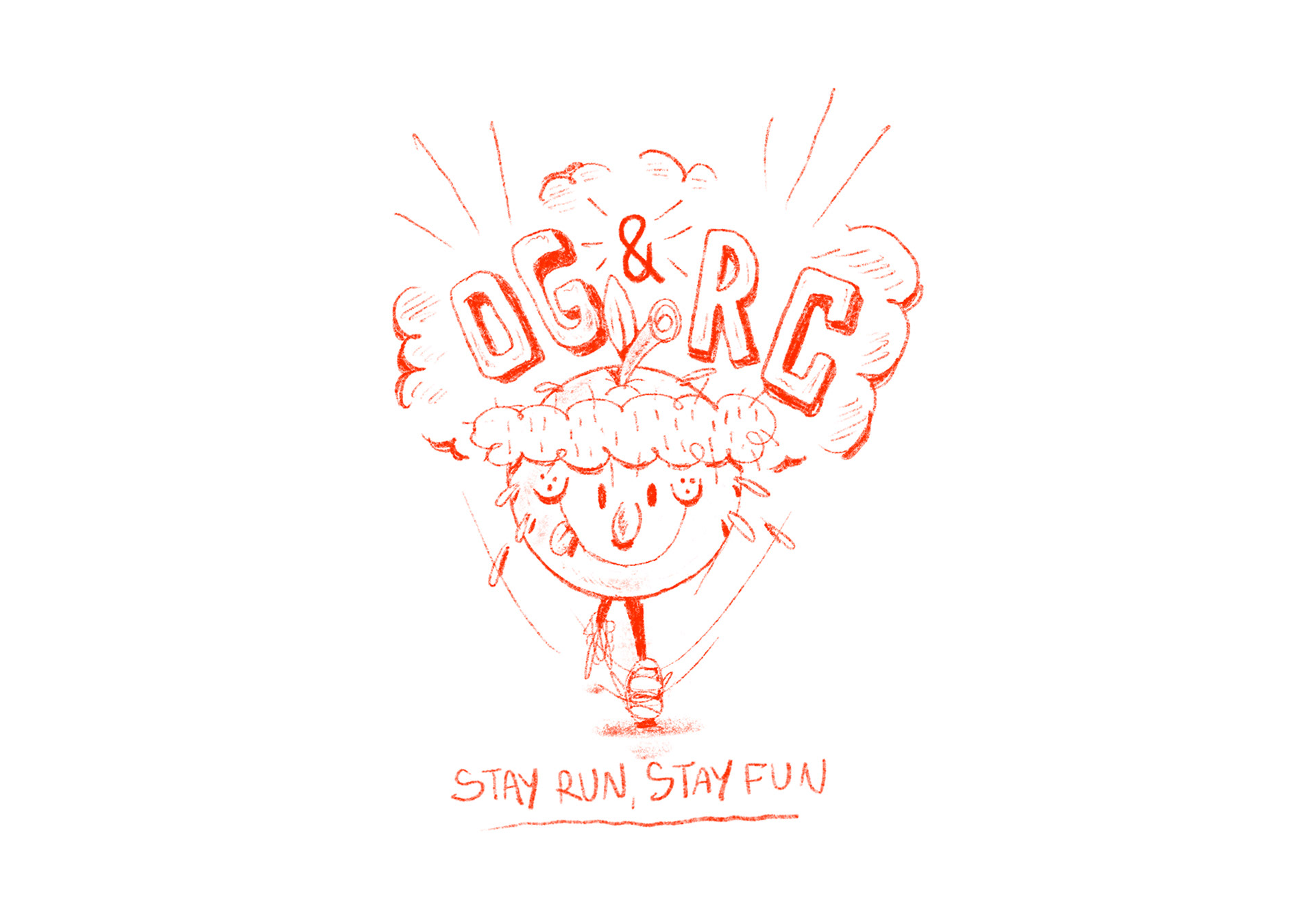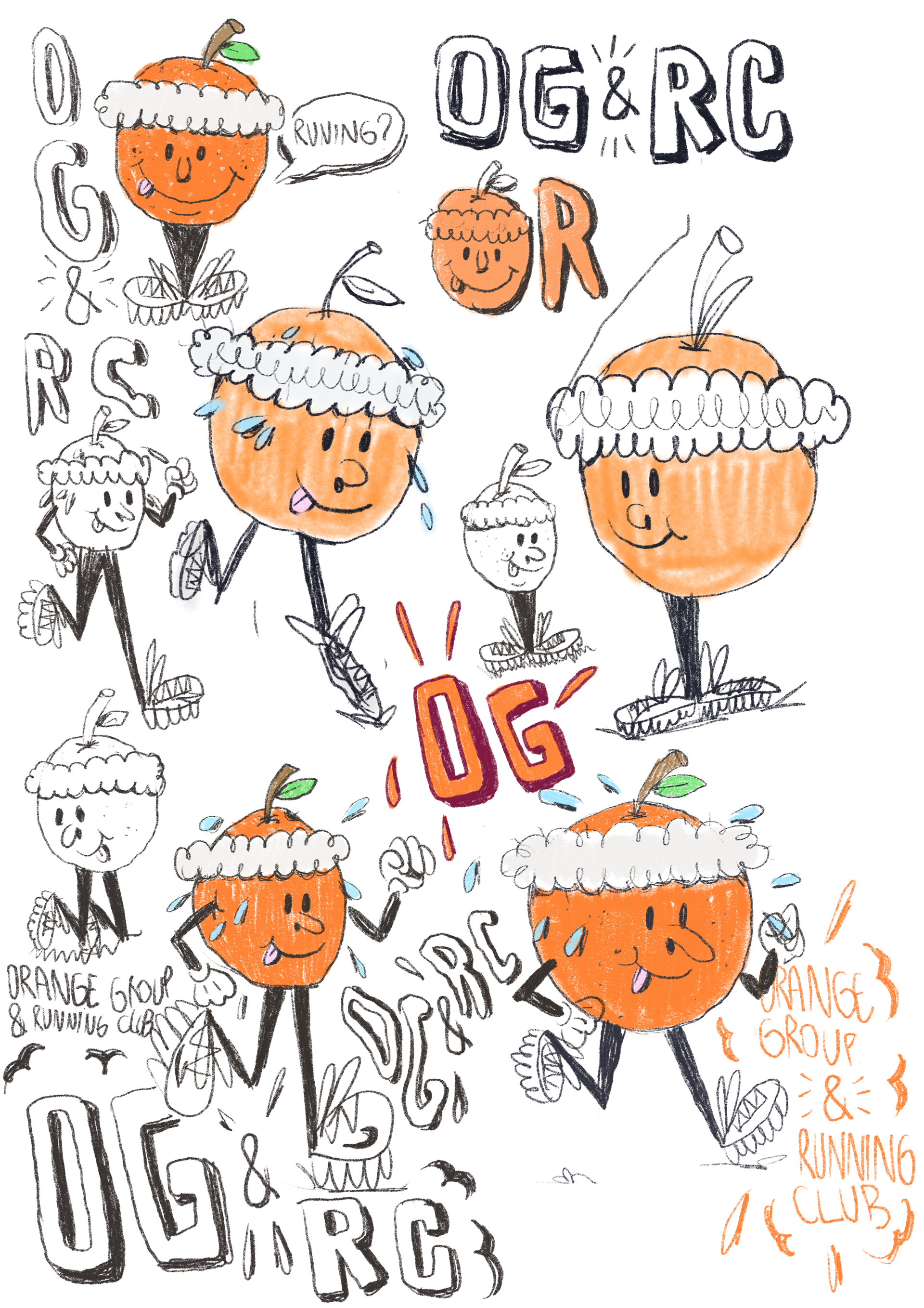First came the name, and with it, the strong need to create a mascot for the group. So I started sketching some orange concepts. After many tests and reworked layers, I arrived at this final version.